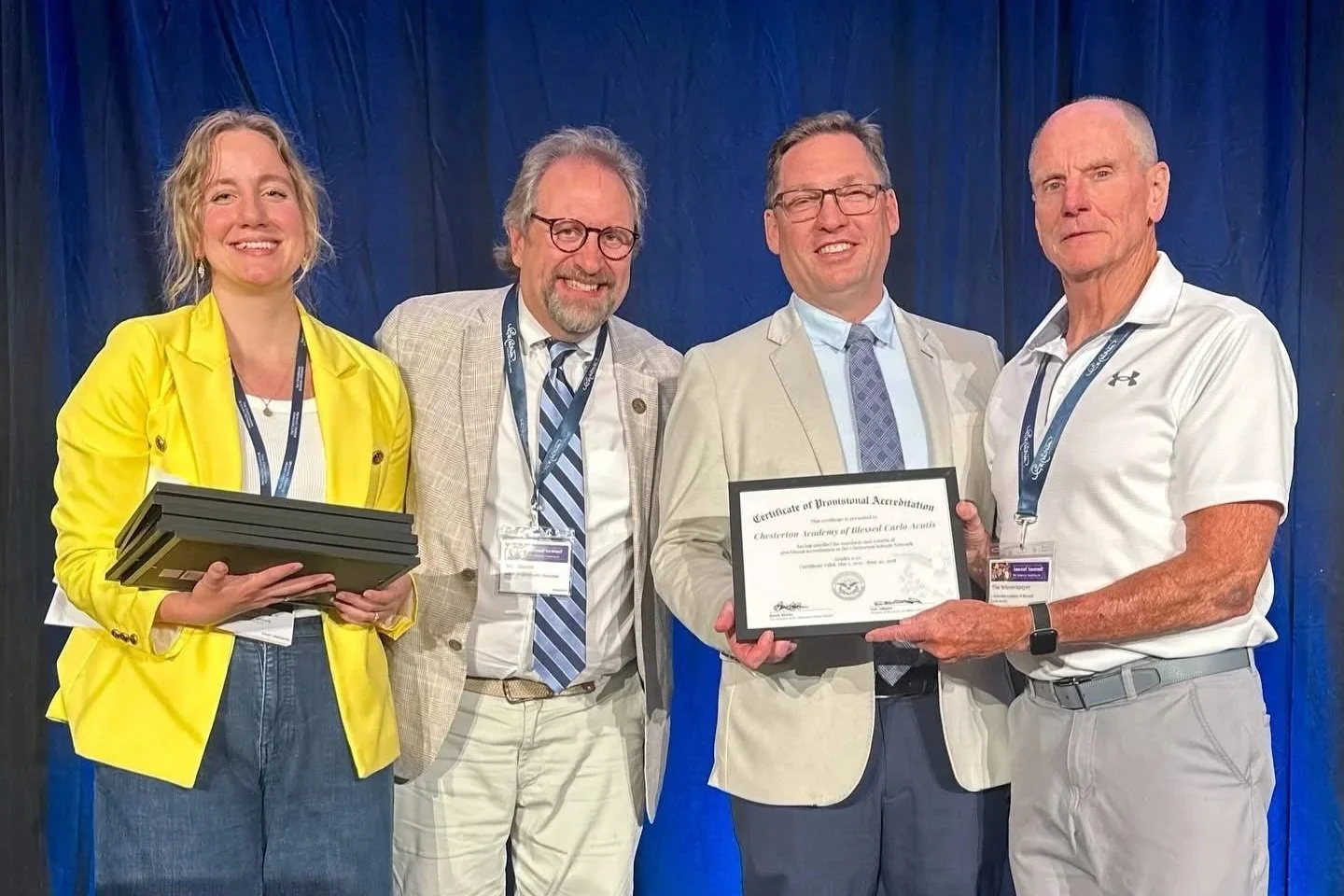 We are excited to share that, after a thorough review by the Chesterton Schools Network, we have received provisional accreditation and approval to become an active school in the network starting with the 2025–26 school year. This honor — presented to us in June at the network’s annual conference in New Orleans — recognizes that we have met the high standards set for achievement and excellence.